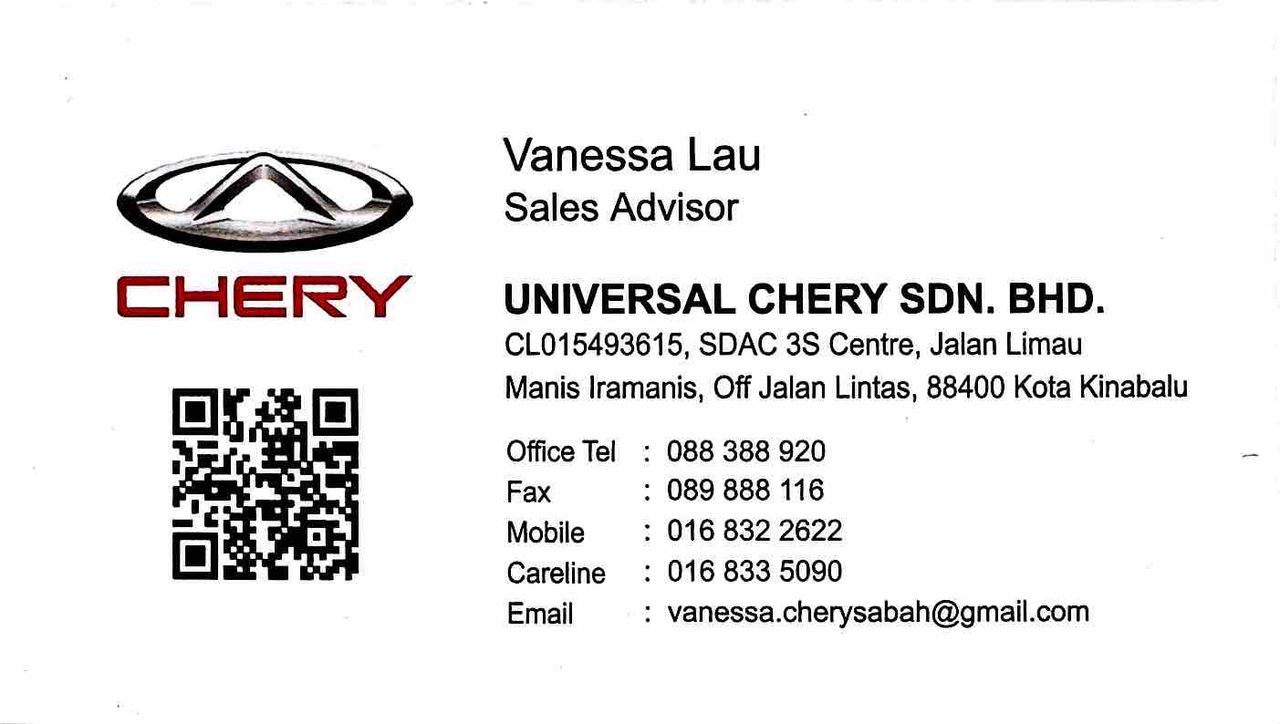 Chery Sales Advisor Many People's Choice, Vanessa Lau a valid and registered Chery sales advisor. My services cover all areas in Kota Kinabalu & all over Malaysia. I offer various models and latest promotions from Chery. I have over 5 years of experience as a Chery sales advisor and I have helped many customers get their dream car. I also offer free advice and enlightenment for clients.